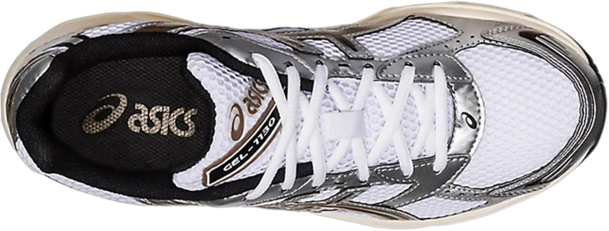 This running shoe is constructed from a mix of synthetic leather and light textile materials that allow for breathability and flexibility. White mesh makes up the base of the shoe, while silver and brown synthetic leather cross on the midsole, creating ASICS’ signature style. The ASICS Gel-1130 sneaker has gel cushioning for comfort and shock absorption. The lining also contains cooling pads to keep your feet from overheating.